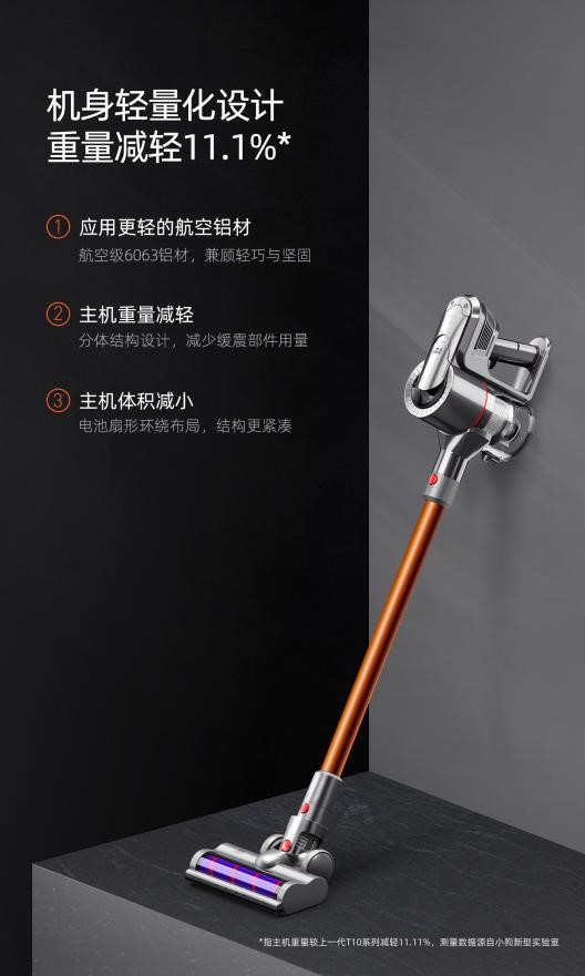 在家庭清潔中,難免會(huì)遇到長(zhǎng)時(shí)間的握、舉、提等操作,這時(shí)一款機(jī)身輕盈的吸塵器帶來(lái)的舒適感,尤其對(duì)女性用戶(hù)十分友好。為了解決用戶(hù)這一痛點(diǎn),小狗無(wú)線吸塵器T11 Pro在機(jī)身上部分采用了密度小強(qiáng)度高的輕質(zhì)航空級(jí)6063鋁材,極大程度降低機(jī)身重量的同時(shí)又提高了堅(jiān)固度。此外,機(jī)身內(nèi)部結(jié)構(gòu)也進(jìn)行了升級(jí)設(shè)計(jì),采用可減少緩震部件用量的分體式結(jié)構(gòu),并搭配緊湊型的電池扇形環(huán)繞布局,進(jìn)一步達(dá)到減小機(jī)身體積的目的。通過(guò)多方面減負(fù),機(jī)器主機(jī)凈重控制在1.48kg,較上一代產(chǎn)品減重11.1%,比戴森V8 slim還輕。能夠減輕清潔負(fù)擔(dān),還能減少腰酸背痛、手腕酸脹等不適。