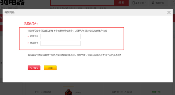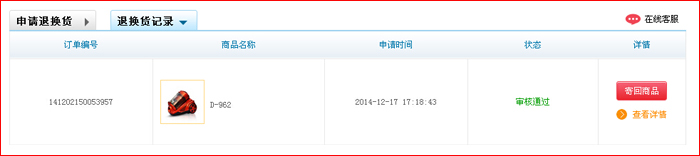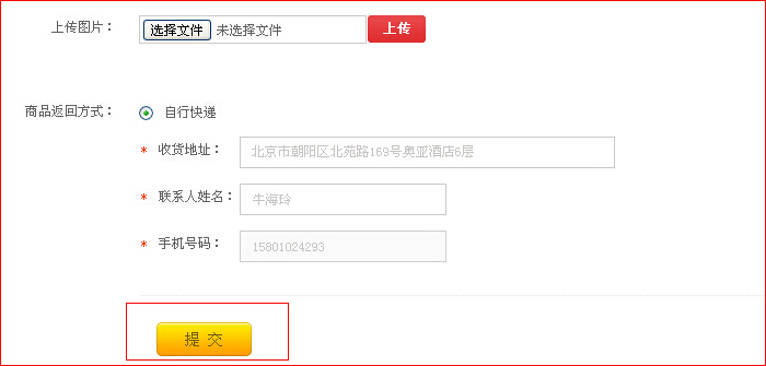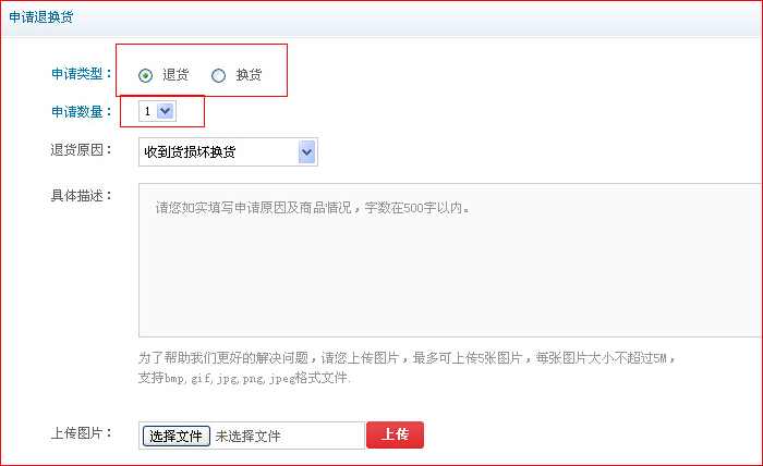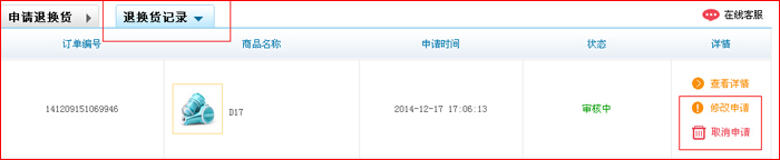 第三步:選擇”退貨“或者”換貨“,然后按要求填寫(xiě)退換貨內(nèi)容,填寫(xiě)完畢后點(diǎn)”提交“按鈕。 (備注:提交完畢后,”審核中“狀態(tài),用戶(hù)可以對(duì)提交信息進(jìn)行取消、修改)