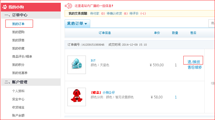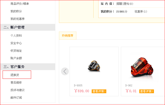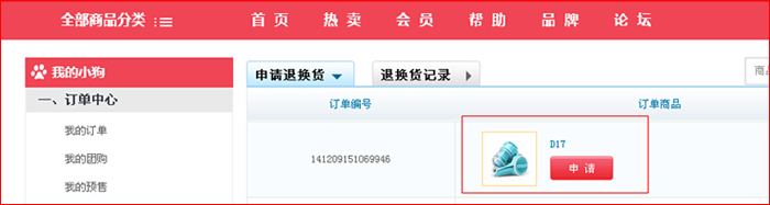 第二步:點(diǎn)擊“我的訂單“退換貨直接進(jìn)入退換貨頁(yè)面,或客戶(hù)服務(wù)下”退換貨“,點(diǎn)擊申請(qǐng)。